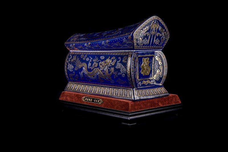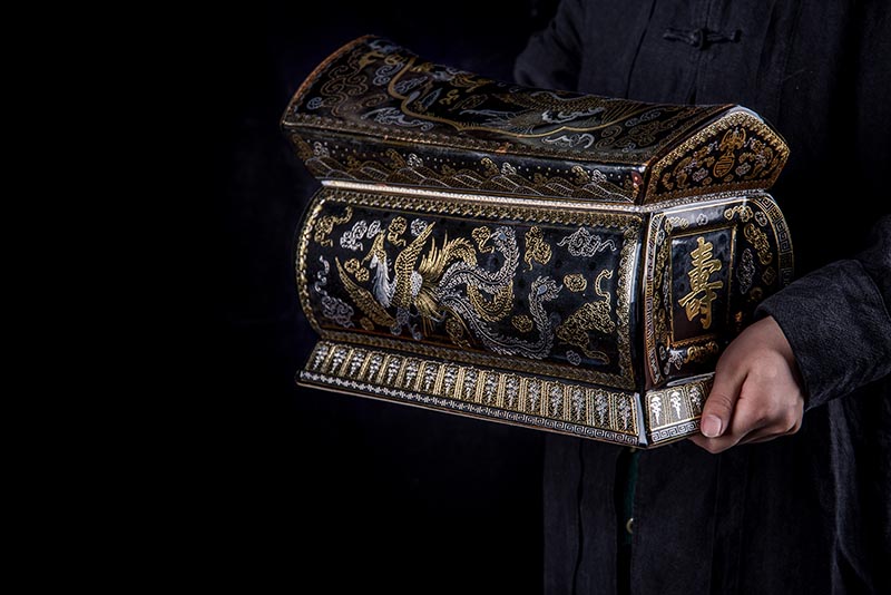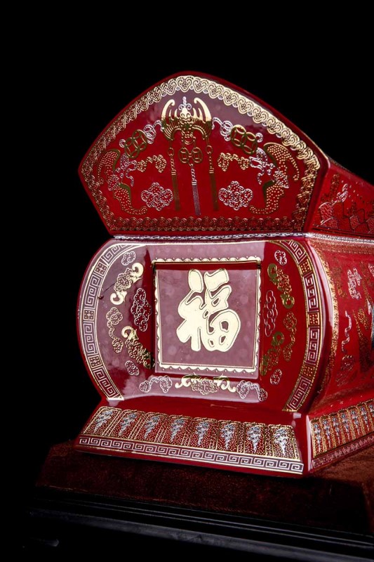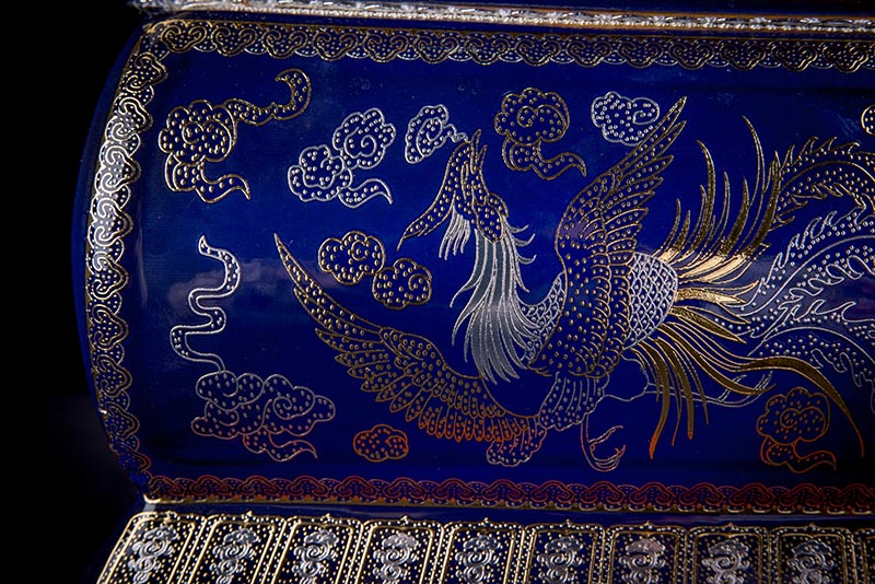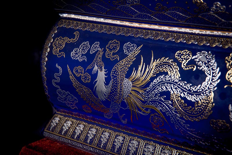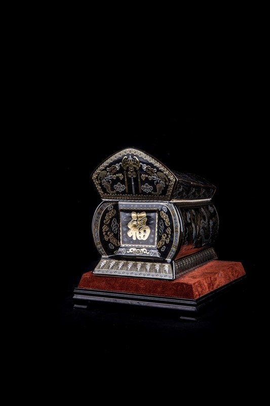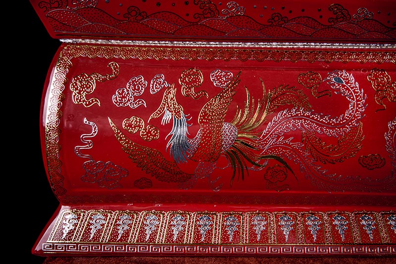 這款【金銀龍鳳】系列產(chǎn)品器型是傳統(tǒng)的長棺造型,古人常說:見棺者,升官發(fā)財,可見它的美好寓意。我們可以看到這款產(chǎn)品,一面龍,一面鳳,素有“龍鳳呈祥”一說,采用的是“錯金銀”工藝,它是中國非物質(zhì)文化遺產(chǎn)名錄的一項美麗的藝術(shù),源自于“春秋戰(zhàn)國時期”至今已經(jīng)2000多年,把這種精湛工藝運用到我們永生盒,既是傳承,亦是發(fā)揚!尺寸:400x220x290mm